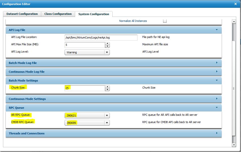 | 390699 RE/CMDB Queue | Unset | 4 [Min] / 8 [Max] | This queue can be set for Normalization. (See screen capture below for reference on how to set the actual NORM RPC Socket.) |