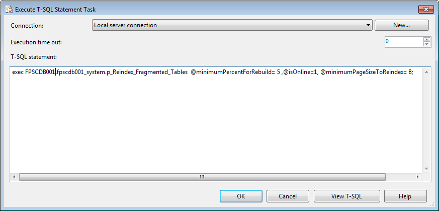 - Double-Click and edit the T-SQL task as shown. The parameters are optional, these are the defaults.