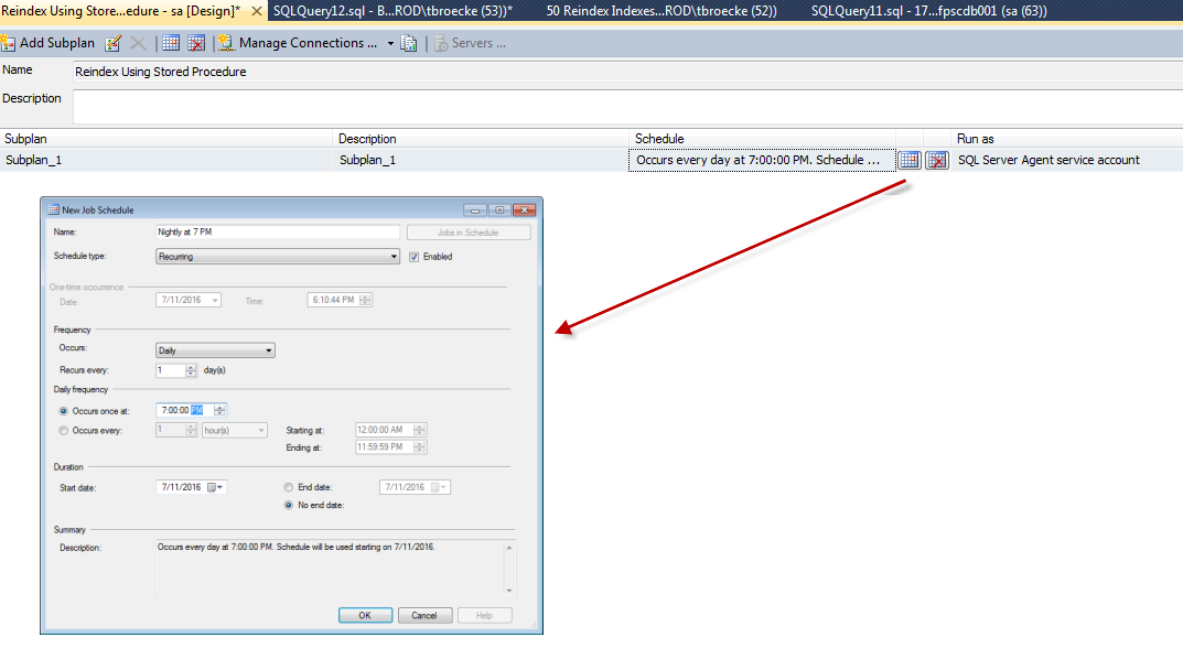 You can use Microsoft’s maintenance plan wizard for creating a reindex plan. We recommend creating a Maintenance plan to run the stored procedure provided because it will avoid unnecessary reindexing and run faster and with less unavailability of the system. This example shows dialogs from SQL Server 2014.