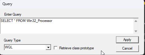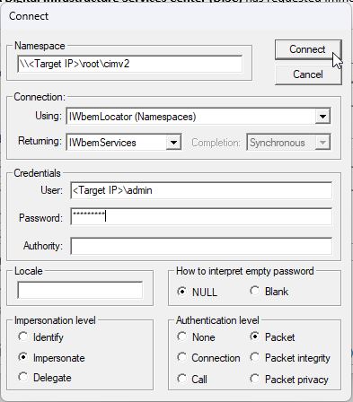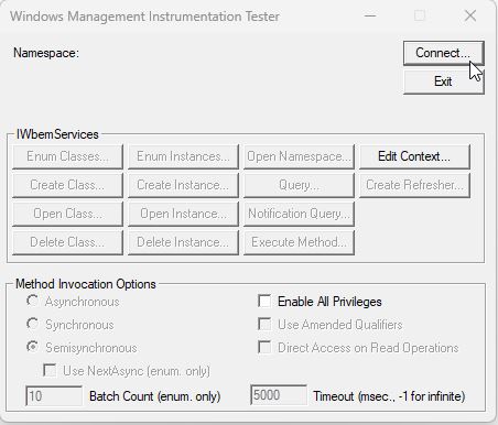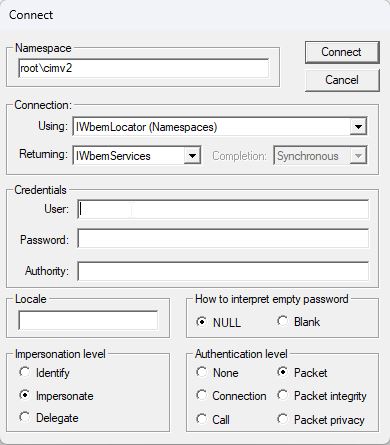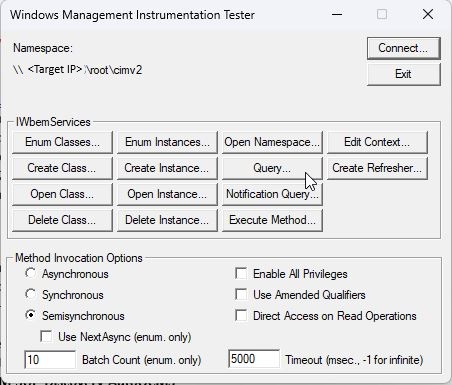 1) From Windows Search bar, search for WBEMTest and start it 2) Click then on "Connect" 3) Modify then "Namespace" field to add \\ at the beginning followed by target system IP, also set "User" and "Password" fields If connection fails WBEMtest should return an error starting with 0x800, please see Discovery: A WMI scan or wmic fails with an error starting with "0x800". If connection succeed, display comes back to following screen (with Namespace set this time), Click on 'Query' button: 4) Execute a query and verify it successfully returns result: Pick up query from Mandatory Methods (the ones with an asterix) in Discovery UI > Administration > Discovery Platforms > Windows > WMI: |