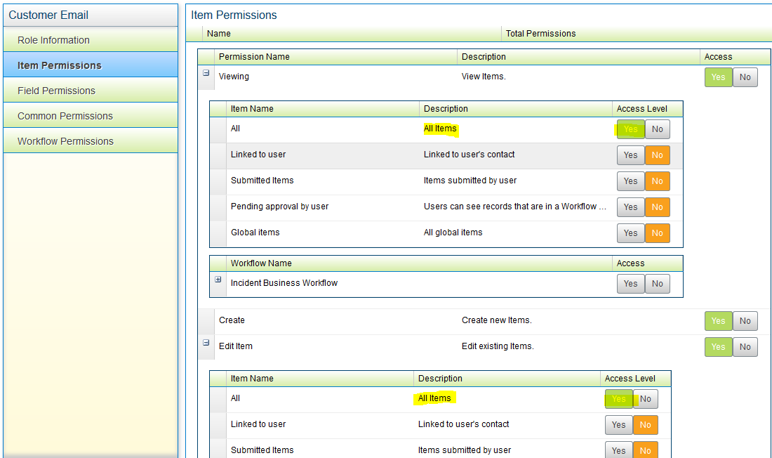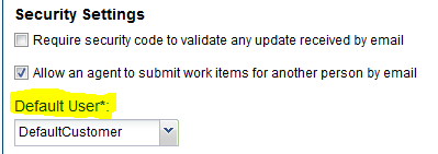 NOTE: Following the release of Footprints 12.1.01, there is a new feature in the "Incoming Email (Workspace)" page. The option is to designate respective fields to put the incoming "From" address, like "Email Address", and the incoming CC values, like "CC Email Address". To allow contacts to update the ticket by email, please change the customer workspace Role permissions to allow "Edit" to the fields selected for this data. This also applies to the "Default User" role discussed below. ________________________________________________________________________________ When configuring the incoming email in FootPrints, the system requires a customer user that has rights to the container you are adding the email account for. The "Default User" must be a customer that has a container role permissions to create and edit any "Ticket". It is strongly recommended to add a new workspace customer role with unrestricted permissions to view or edit a "Ticket" for the "Default User". When using the default role, "Request Read/Submit/Edit", the "Item Permissions" for the Item edit rights can create an error email when trying to update an existing ticket. The error email body: The Ticket #XXX could not be updated. Error: Access denied. Cause: SecurityServiceException. Try again later or contact your Administrator for assistance. There are are several possible causes for an agent or customer to get this message: 1. The Administration>System Management>Email Settings>Incoming Email (Workspace) may have restrictions on whom can reply and edit by email. Setting every thing to "Yes" is the most permissive. 2. The email is not from a sender that has permissions to edit the ticket. The system is going to look for a match of the "FROM" email address to any of the "Users" email addresses. If it finds a match, it will use the role permissions of the sender on the edit. If the sender is not the contact or the submitter, the default "Item Permissions" view and edit item rights can generate the error message. If the sender is a CC, they are not considered the contact, and cannot update with the default item edit permissions. Enabling "All Items" for both Viewing and Edit Item will ensure the sender has permissions to update any "Ticket". But, if they login, they will be able to see all items and edit them. 3. If the system does not find a match in the users table for the senders "From" address, it will use the permissions of the "Default User" workspace role. It is strongly recommended to create a new workspace customer role to ensure "Anyone" can edit the ticket by email. When adding or copying the new role, you will need to change the default users role item permissions to the format below, allowing Viewing and Edit Item to be "All Items". I recommend creating a unique Role for the default user so the regular customer roles are not modified. Also, edit the field permissions to allow edit to all fields in the item.